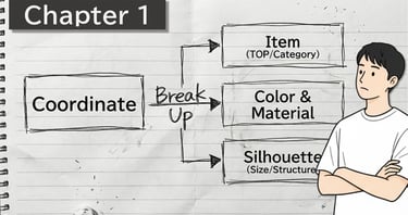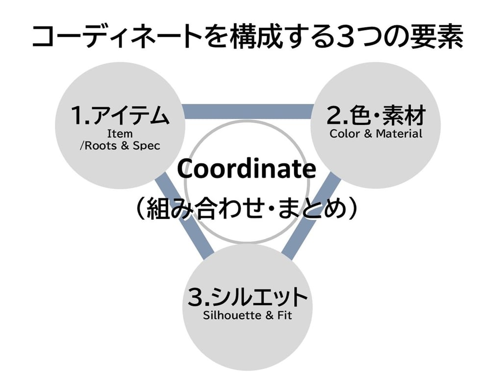 基本構造: ファッションコーディネートは、無限の組み合わせではなく、「アイテム」「色・素材」「シルエット」という3つの変数で構成される論理的な構造物。