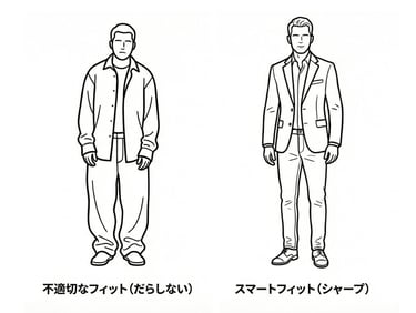 サイズが合っていない服は、だらしないシワを生み、あなたの外見を実際以上に悪く見せます。