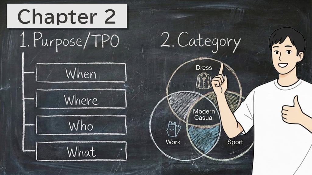 服を選ぶ前に、まずビジネスで使い慣れたフレームワーク「5W1H」をファッションに応用し、「着る目的」を決めます。このステップを飛ばして「どの服がお洒落か?」と悩むのは、目的地を決めずに電車に乗るようなものです。