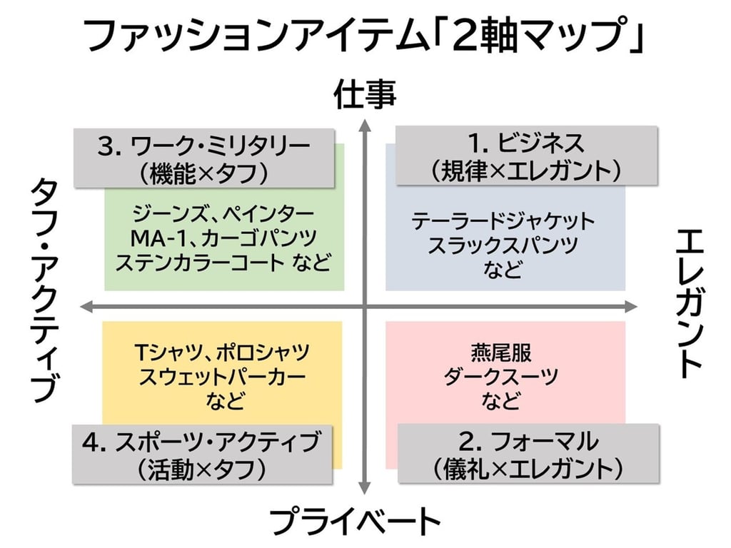 複雑な情報や課題をシンプルに整理する方法として「マトリクス(2軸)整理法」が有名ですが、ファッションも同様に、以下の2つの軸で分解すると、その立ち位置がわかりやすくなります。