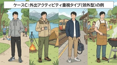 動的な活動: 運動、BBQ、旅行。動きやすさや体温調整のしやすさが重要。