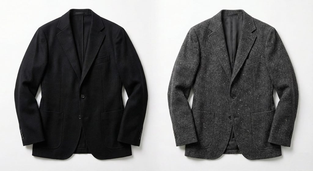 ✓ 素材: 起毛感のある「フランネル」や、ざっくりとした「ツイード」など、温かみのある厚手の素材を選びます。ビジネススーツのような生地(ギャバジン、平織り等)は、「仕事着の流用」に見えやすいため避けたほうが良いでしょう。