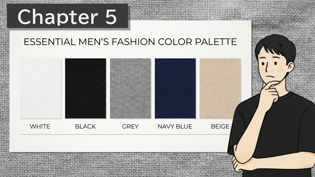 解決策(基本色): メンズファッションのベーシックカラーは、「モノトーン(白・黒・グレー)」と「ネイビー・ベージュ」の5色で十分。各色の役割や与えるイメージを理解すると、一層扱いやすくなる。