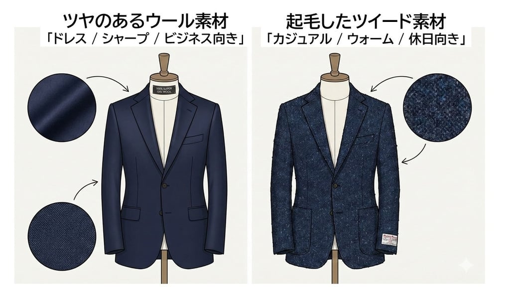 素材の違いの活用例を紹介します。同じ「ネイビー」や「黒」を選んでも、素材の質感によって、相手に与える印象は劇的に変化します。これを理解することが、脱初心者への大きなステップです。