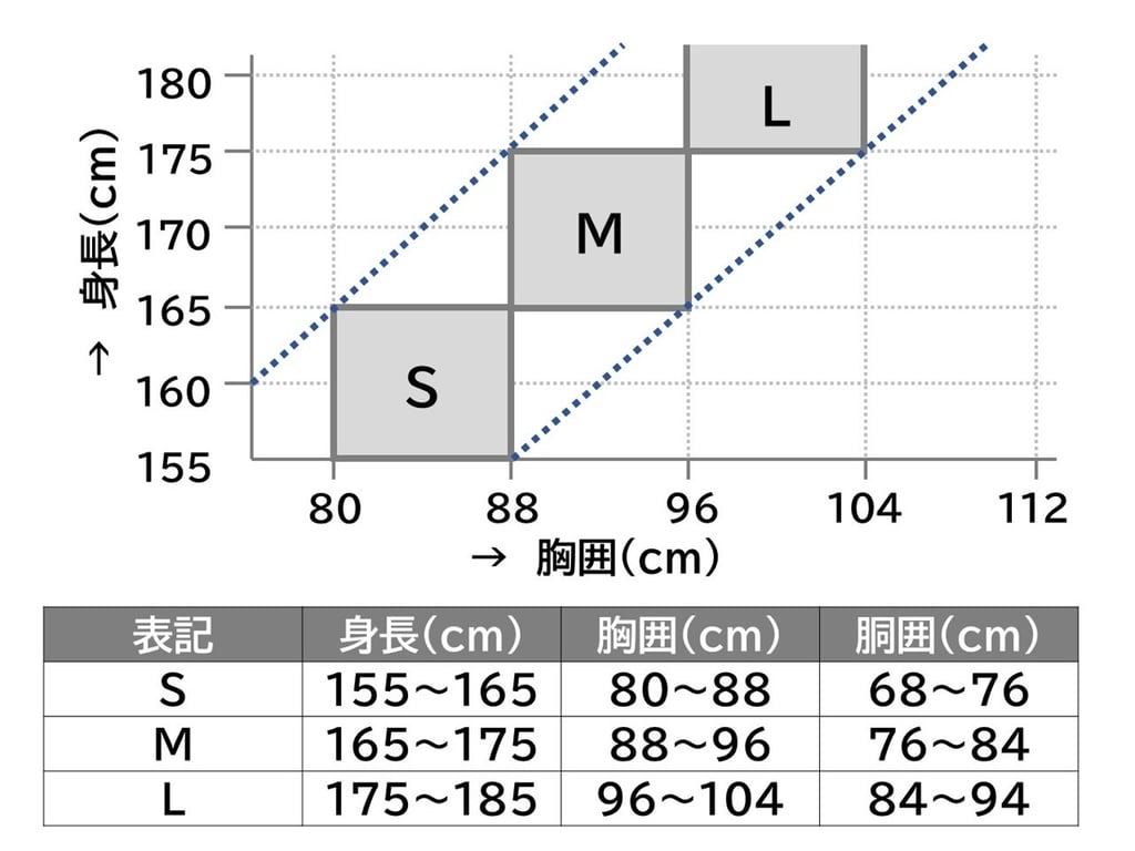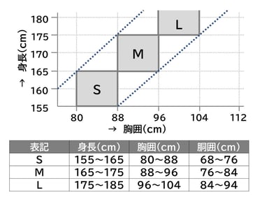 身長:165cm ~ 175cm、胸囲:88cm ~ 96cm