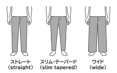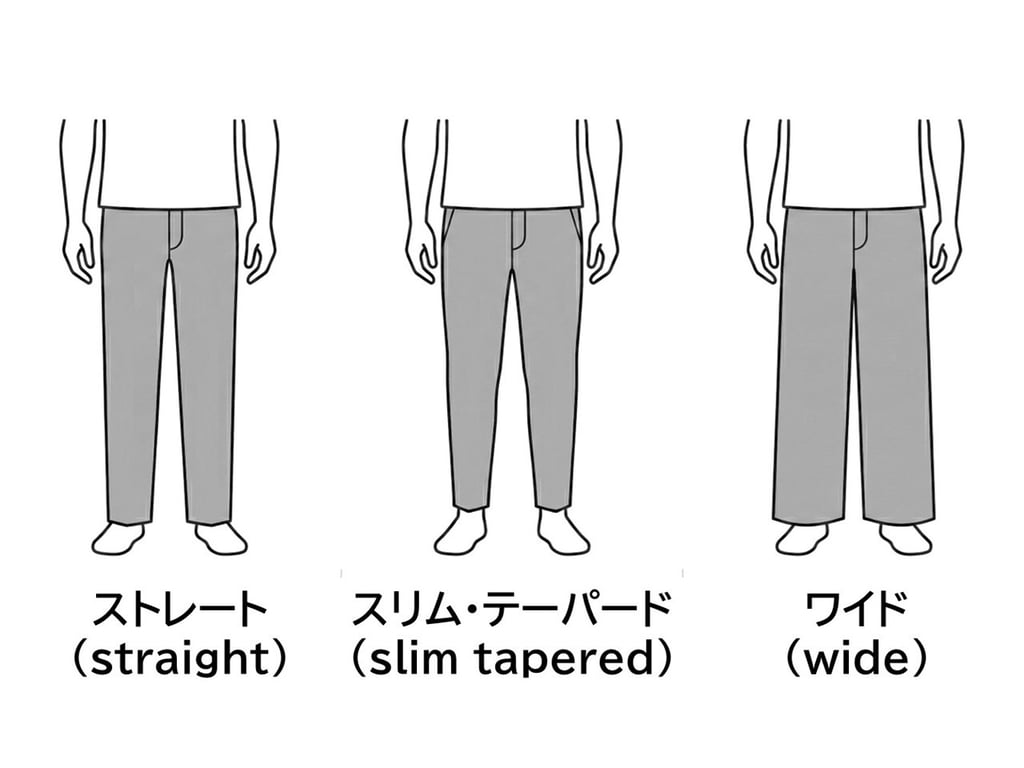 パンツ(ボトムス)のシルエットは、全体の印象を支える土台です。 トップスのサイズが合っていても、ボトムスの選び方を間違えるとコーディネート全体が台無しになります。主に以下の種類があります。