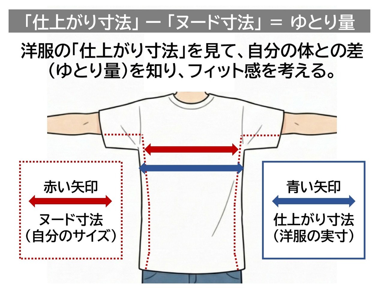 課題:サイズ選びの失敗は、「自分の身体の寸法(ヌード寸法)」と「服の設計寸法(仕上がり寸法)」を把握していないことから生じやすい。