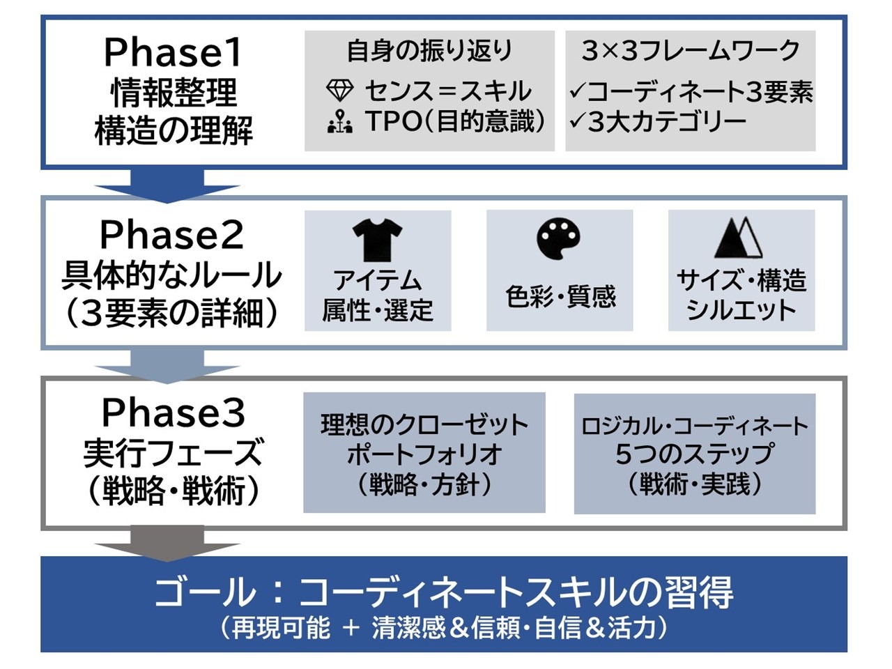 課題:個別の知識(アイテム、色、シルエット)は学んだが、それらを「どう統合して実践すればいいか」の全体像が見えない。