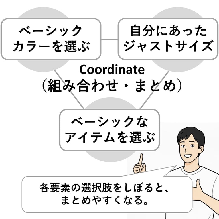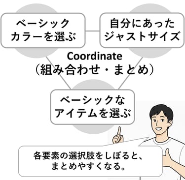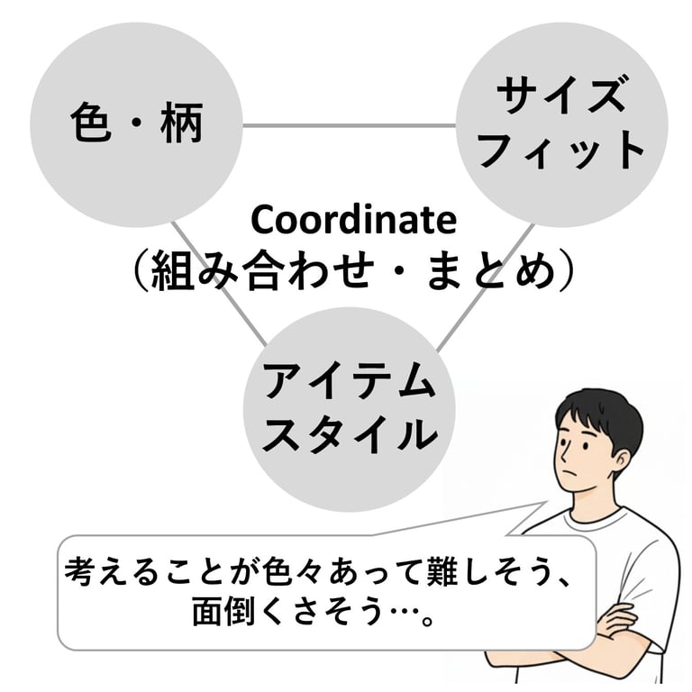 「コーディネート」とは個々のアイテムを組み合わせて全体の調和をはかることですが、これがとても複雑怪奇に見えます。コーディネートはおおまかに「色・柄」「サイズ・フィット」「アイテム・スタイル」の3つの要素の組み合わせで決まりますが、この組み合わせを考えなければならないのです。これがコーディネートの難しさの最大のポイントとなります。