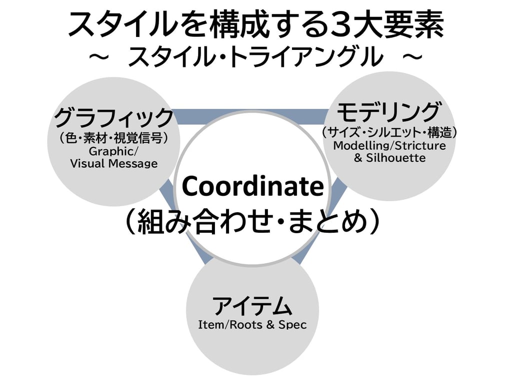 複雑なファッションを論理的に攻略するために、私は主な要素を「スタイル・トライアングル(3つの設計要素)」として定義しました。世界中の専門家が重視する「サイズ・素材・目的」の3原則を、より実践的に整理したものです。