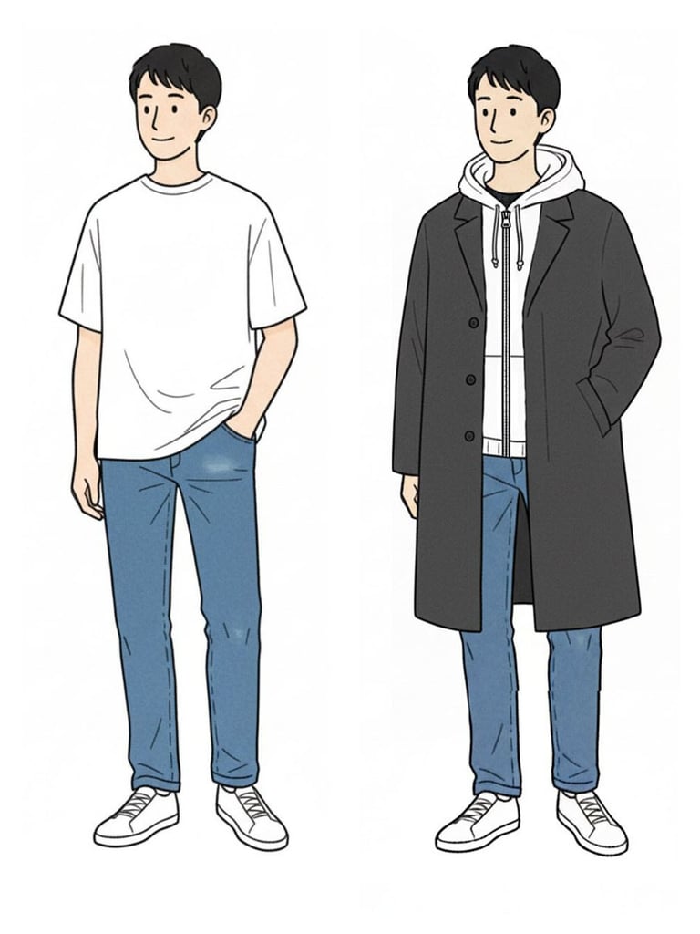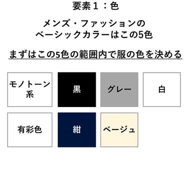 理屈を分かりやすくする為に3つの要素に集約しているものの、個々の要素も深堀するときりがありません。もちろん個々の要素をさらに深く知ることでコーディネートに柔軟性が生まれ、さらにレベルアップが図れるのですが、まずは要素をシンプルにすることから始めるほうが成功率が高まります。以下は要素を固定するテクニックの一例です。