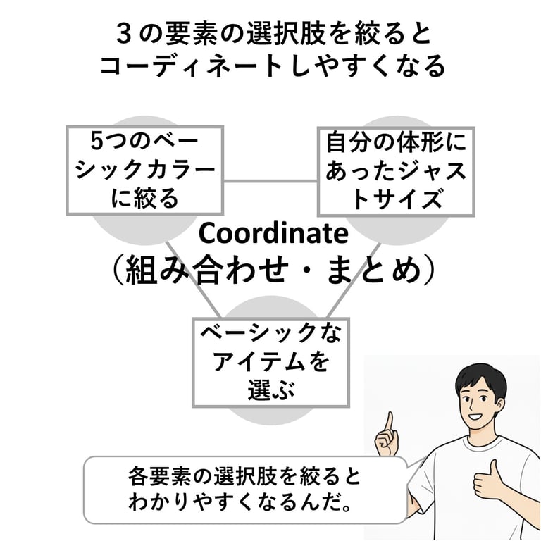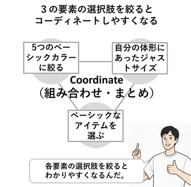 そこでコーディネートを効率良く組み立てるポイントですが、「できるだけ考える要素を減らす」事です。
